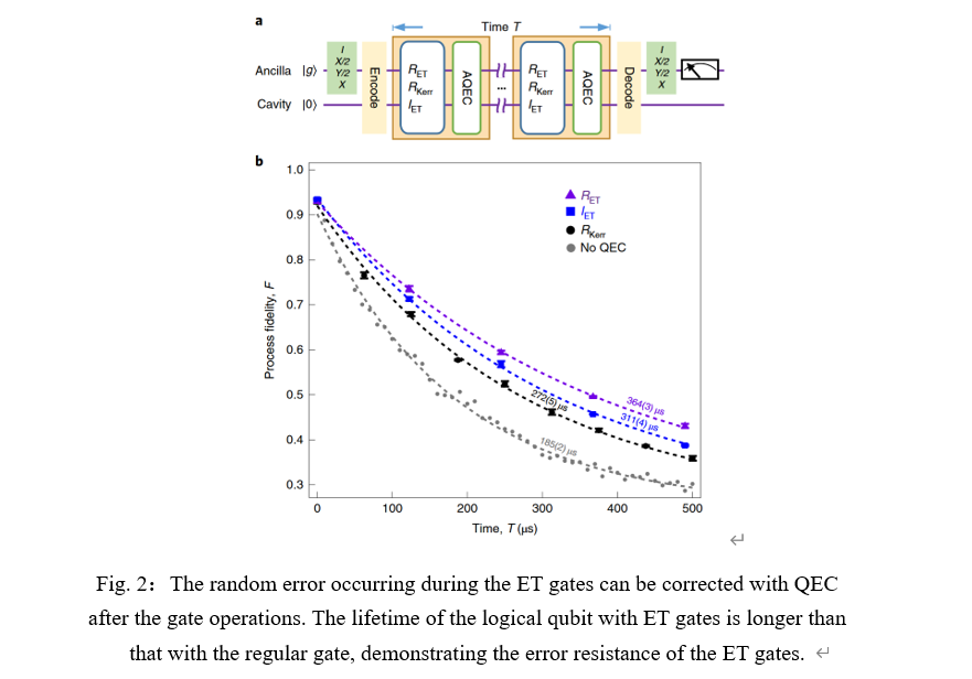 The hybrid quantum system that the group investigates consists of a superconducting qubit and a bosonic microwave cavity. Quantum information is encoded on superpositions of photon Fock states in the cavity with carefully chosen binomial coefficients, which can correct single photon losses, the dominant error channel of this system. In 2019, the group demonstrated QEC and universal gate set operation on this binomially encoded logical qubit (Nature Physics 15, 503–508 (2019)). In order to further tolerate the single-photon-loss error during the gate operation, ET gates require the dynamical evolutions of the logical qubit under the gate Hamiltonian are identical in both the code and error spaces. Therefore, the group developed a new technique, called photon-number-resolved ac Stark shift, to tune the frequency of each Fock state in the cavity precisely such that the ET condition is fulfilled. Their experiment demonstrated that the ET gates on the logical qubit indeed significantly outperform the regular gate with a higher gate fidelity when an error occurs during the gate operation. Furthermore, the lifetime of the logical qubit under repetitive and interleaved ET gates and QEC is longer than that with the regular gate.
