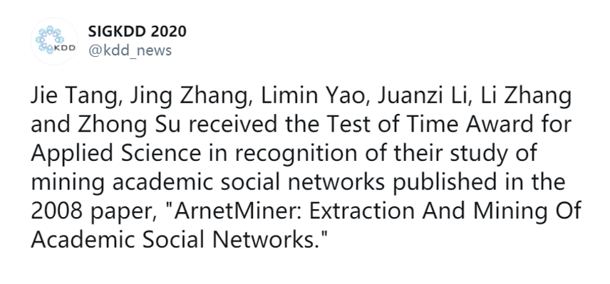 A Tsinghua Computer Science led team was awarded the SIGKDD 2020 Test of Time Award for Applied Science, for their paper debut at 2008: ArnetMiner: Extraction and Mining of Academic Social Networks, which was authored by Jie Tang, Jing Zhang, Limin Yao, and Juanzi Li (from Tsinghua) and Li Zhang and Zhong Su (from IBM Research, China). This paper introduces the underlying framework and core technologies in the ArnetMiner system, an author-centric academic search and mining system.