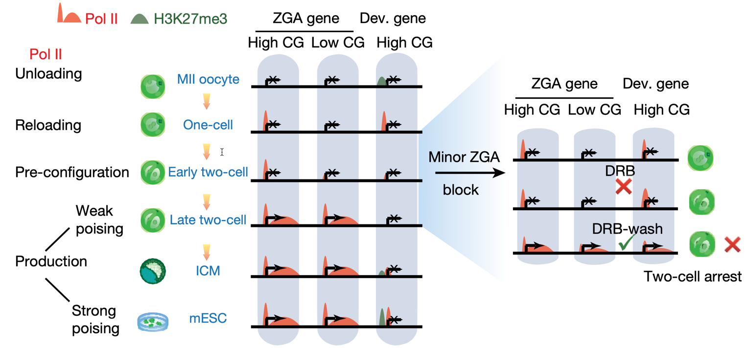 To address these questions, the researchers focused on RNA polymerase II (Pol II), the central player of transcription machinery. Traditional ChIP-seq method, which often requires a large number of cells, is not suitable to study Pol II in early embryos. By developing Stacc-seq (in collaboration with Vazyme Biotech), a highly sensitive approach to detect the interaction between protein and DNA genome-wide, the researchers discovered that Pol II undergoes “loading, pre-configuration, and production” during ZGA. After fertilization, Pol II is preferentially loaded to CG-rich promoters and accessible distal regions in 1-cell embryos (“loading”), in part shaped by the inherited parental epigenome as shown for maternal DNA methylation. Interestingly, Pol II already initiates the re-location to future gene targets prior to genome activation (“pre-configuration”), before it later engages in full transcription elongation upon major ZGA (“production”). These results may explain why ZGA does not occur immediately after fertilization. Since drastic epigenetic reprogramming occurs after fertilization, the firing of Pol II needs to be synchronized with the maturation of chromatin, and ZGA presumably cannot start until the Pol II pre-configuration is completed.
