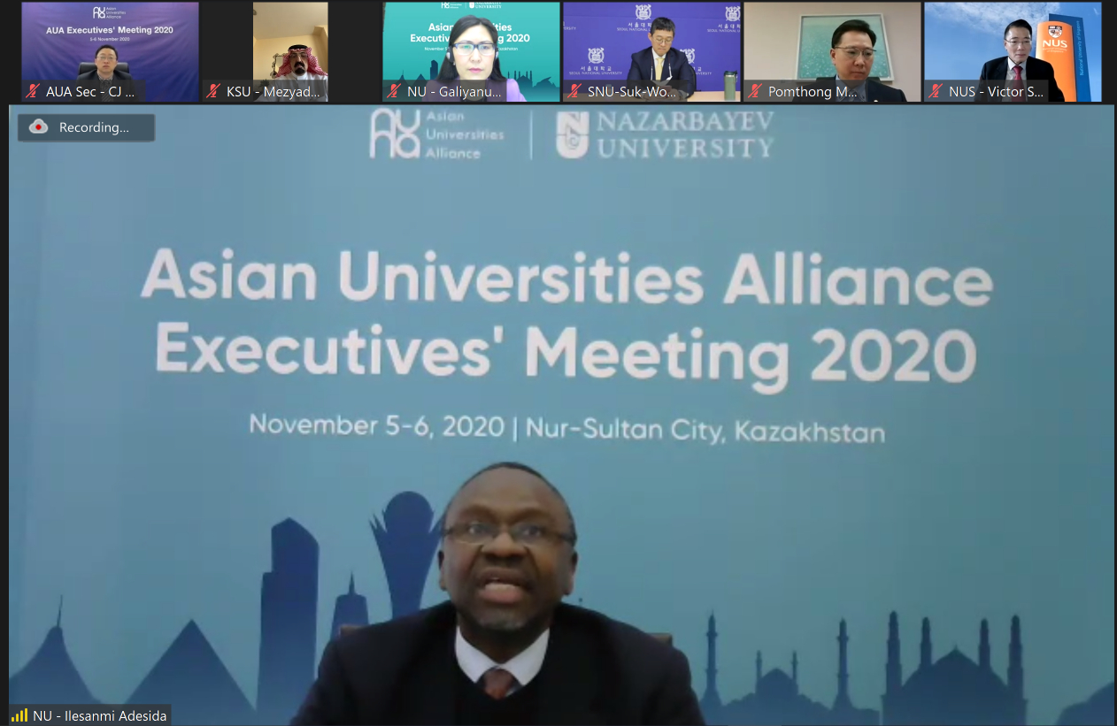 The AUA Executives' Meeting (AUAEM) 2020, hosted by AUA Executive Presidency 2020-2021 Nazarbayev University, took place online on 5-6 November 2020. Over 70 participants representing all AUA member universities were in attendance across both days of the AUAEM. Yang Bin, Vice President and Provost of Tsinghua University, delivered the welcome address at the opening ceremony.