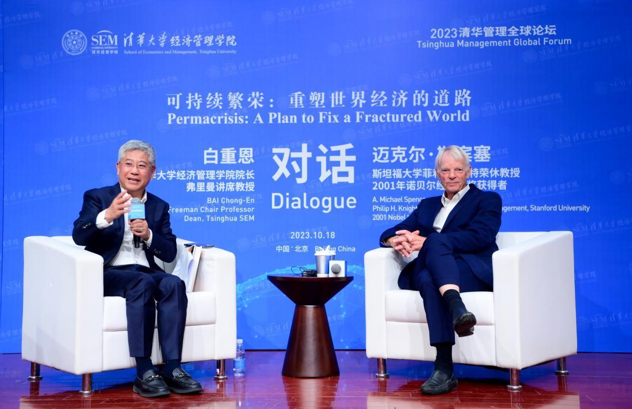 Michael Spence (R), professor emeritus of management of Standard University and 2001 Nobel laureate in economics, and Bai Chongen, dean of the School of Economics and Management of Tsinghua University, hold a dialogue during the 2023 Tsinghua Management Global Forum in Beijing on Oct. 18, 2023. [Photo provided to China.org.cn]