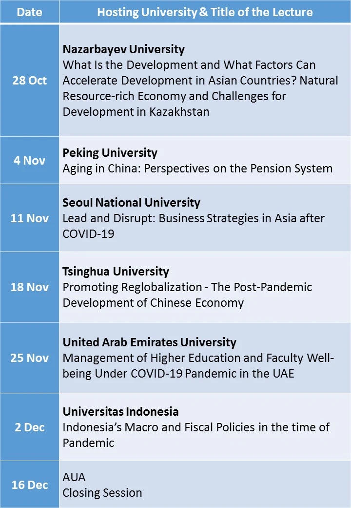 In September 2021, AUA will launch a joint online lecture series as an attempt and first step towards the long-term goal of an online shared course. In the lecture series, 16 eminent scholars from 14 leading universities in Asia will address the challenges and opportunities of Asian economies in the post COVID-19 era.