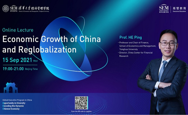 At 19.00-21.00 Beijing time of September 15, Prof. HE Ping, Chair and Professor of Tsinghua SEM, will deliver the online lecture Economic Growth of China and Reglobalization.