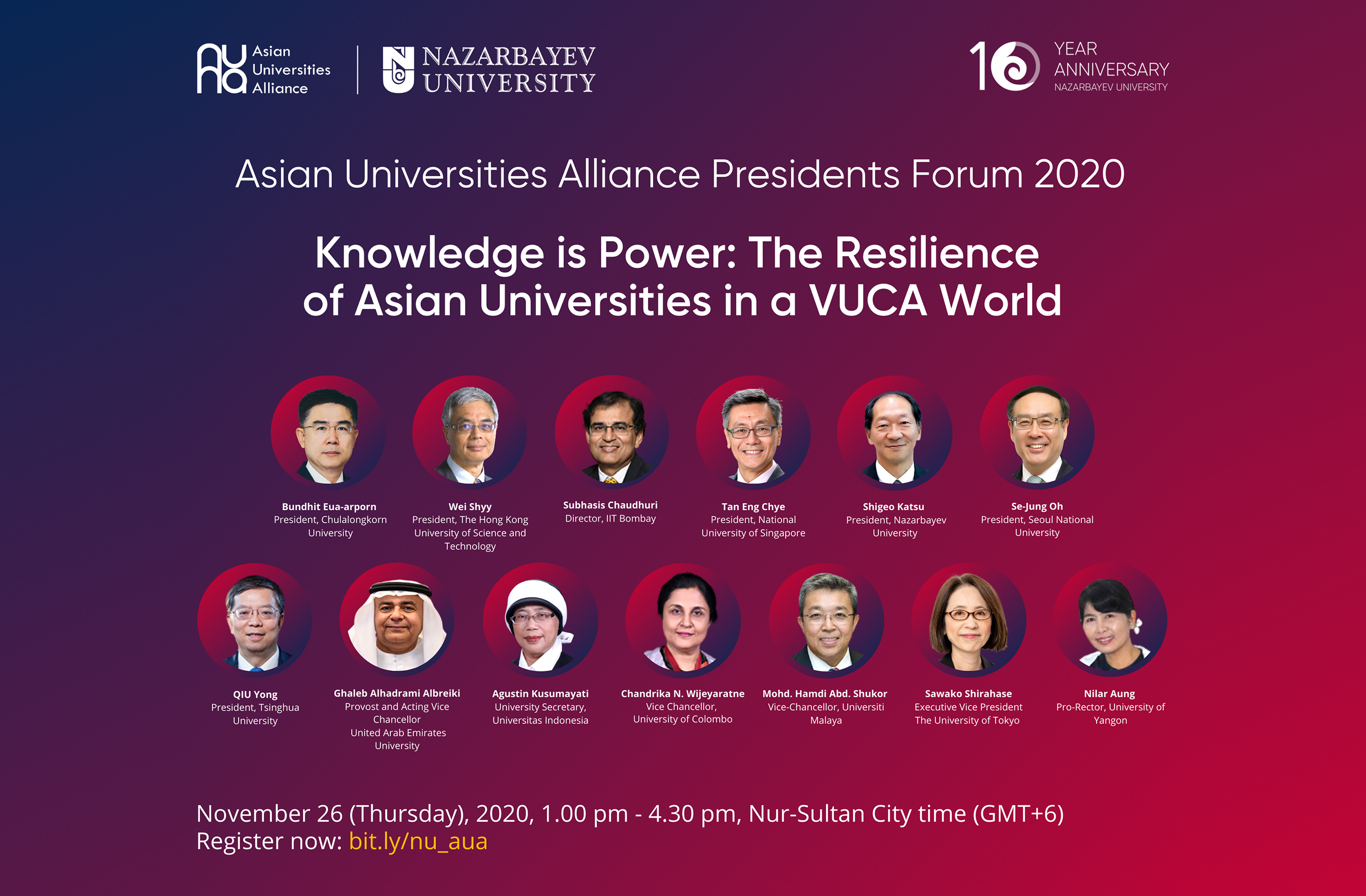 The Asian Universities Alliance (AUA) Presidents Forum 2020, themed "Knowledge is Power: The Resilience of Asian Universities in a VUCA World", jointly organized and hosted by AUA Executive Presidency 2020-2021 Nazarbayev University and the AUA Secretariat, will be held online from 15:00-18:40 on November 26th, Beijing time.