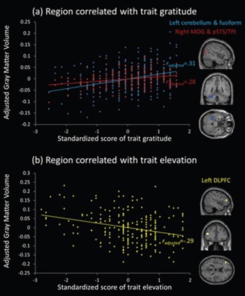 MRI and questionnaires have been used to identify the common and distinct neuroanatomical correlates of the traits of gratitude and elevation (the uplifted feeling that people experience when they see unexpected acts of human goodness.