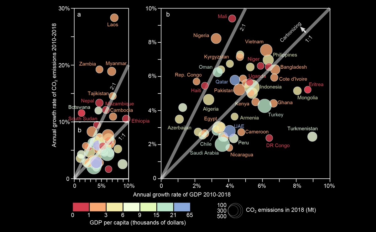 “We are at a tipping point for energy transition,” explains Guan. Emerging emitters are countries in development categories ranging from the least developed country to economy in transition. In most cases with gross domestic product per capita substantially less than the global average. From their analysis of historical emissions drivers, Guan’s group shows that industrialization and extended energy infrastructure are the driving forces of the emissions surges and these factors are likely to continue to cause emissions to grow.
