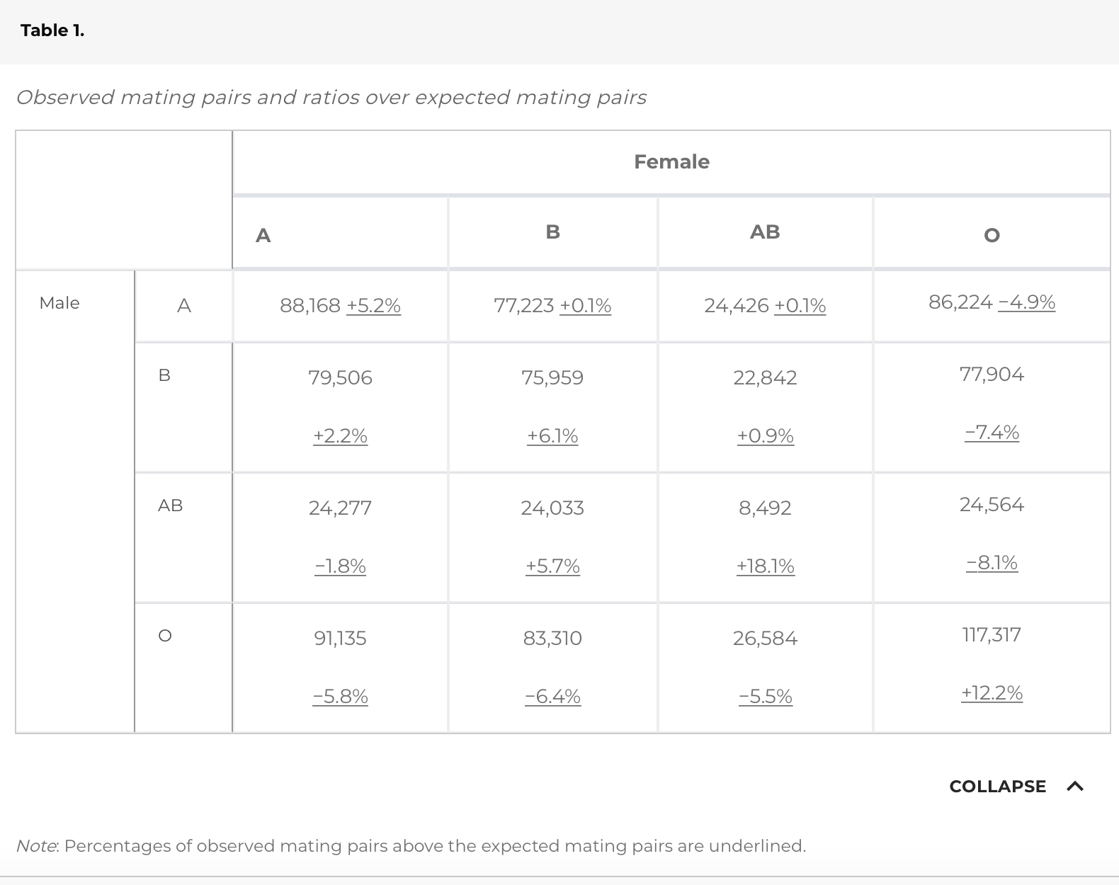 Another Tsinghua author, Ke Tang, also from the Institute of Economics, says: “One possible explanation is that blood type may act as a proxy for other phenotypes.” To look more deeply at this, the researchers examined phenotypic variables available in their data, such as education, job type, height, weight, pressure, and drinking habits, and found some statistical links to blood types. However, when the statisticians controlled for these variables, they still found strong evidence for separate blood-type mating tendencies.