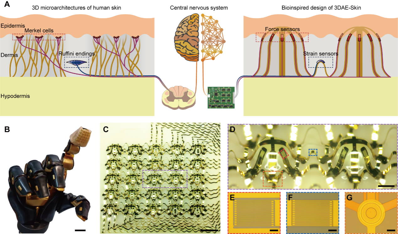 Inspired by human skin, they created a three-dimensionally architected electronic skin with force and strain sensing components arranged in a 3D layout that mimics that of Merkel cells and Ruffini endings in human skin. This 3DAE-Skin shows excellent decoupled sensing performances of normal force, shear force, and strain. It is the first-of-its-kind with force and strain sensing components arranged in a 3D layout that mimics that of slowly adapting mechanoreceptors in human skin.