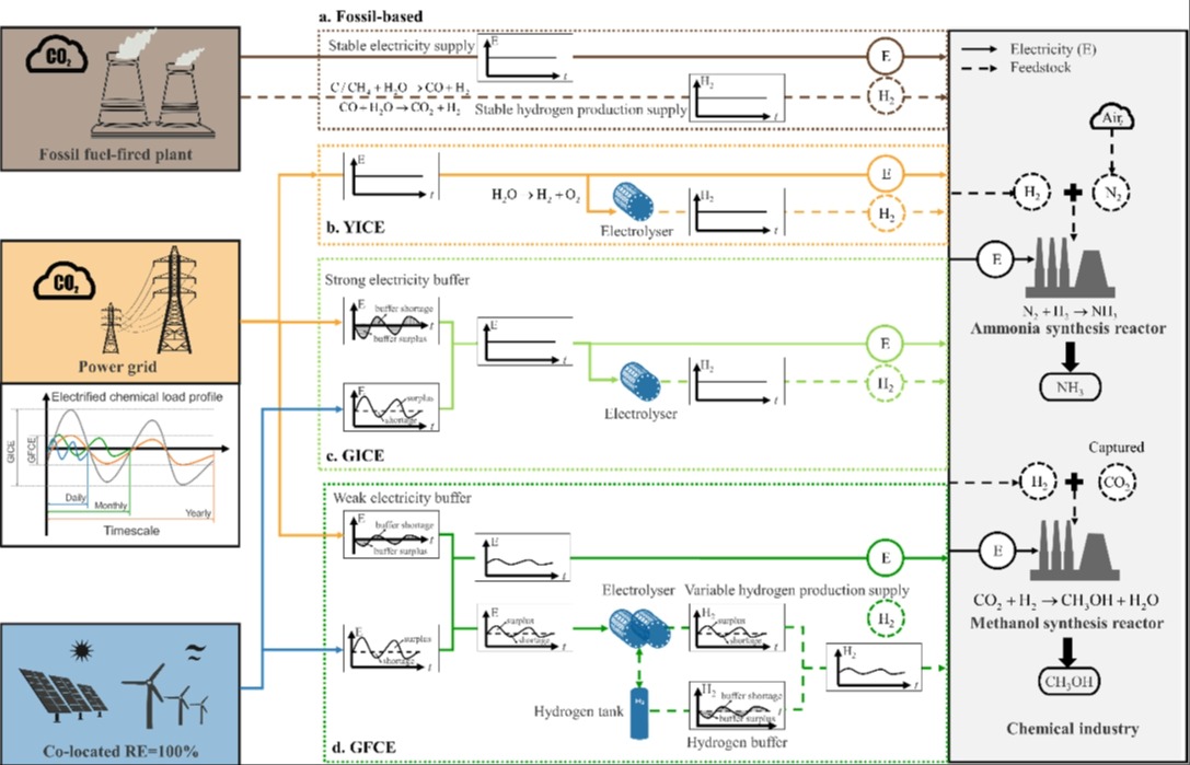 Current electrification pathways for the chemical industry mostly rely on grid power, which often shifts carbon emissions from the chemical sector to the power sector and may even increase the total carbon emissions nationwide. To address this, the research team has proposed a new approach called "green flexible chemical electrification" (GFCE). This approach constructs an integrated system through a direct connection to green power and combines advanced hydrogen-ammonia-methanol coupling control and scheduling technologies to achieve deep electrification of the chemical production process. Compared to electrification pathways that rely solely on grid power, the GFCE approach not only significantly reduces carbon emissions in both the power and chemical sectors but also optimizes operations through electric-hydrogen synergy, minimizing impacts on the grid and enhancing the security of the power system.
