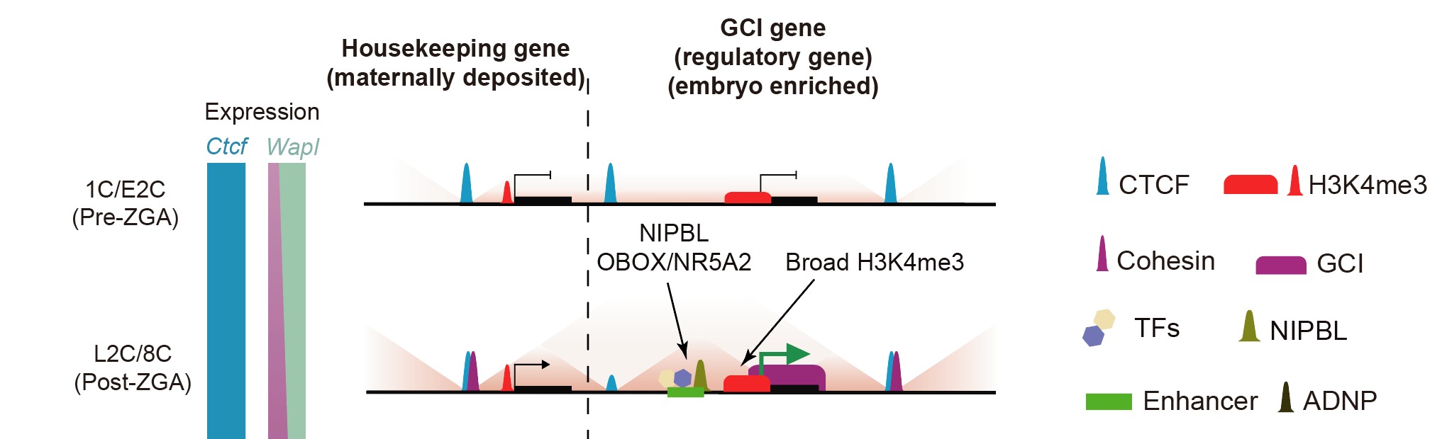 GCI genes are enriched for key regulatory genes involved in chromatin organization, developmental regulation, and cell fate determination. These genes exhibit broad promoters of H3K4me3, and are enriched for active enhancers and binding of key TFs and NIPBL in their neighbor regions, providing abundant cohesin loading sites for GCI formation. Previous studies suggest that RNA polymerase can act as a barrier by pushing or hindering it from sliding on chromatin. Consistently, GCIs function as transcription-dependent insulators, cooperating with adjacent CTCF sites to form TAD-like interaction domains, without obvious directional preference. Partial cohesin knockdown weakened GCI boundaries and downregulated GCI gene expression, ultimately causing embryonic arrest at the morula stage. Further analyses showed that GCI genes, as key regulators, exhibit low cell-to-cell transcription variability, whereas cohesin KD increases transcriptional heterogeneity among blastomeres of 8C embryos, suggesting that GCIs may help maintain stable expression of critical regulatory genes during embryonic development.