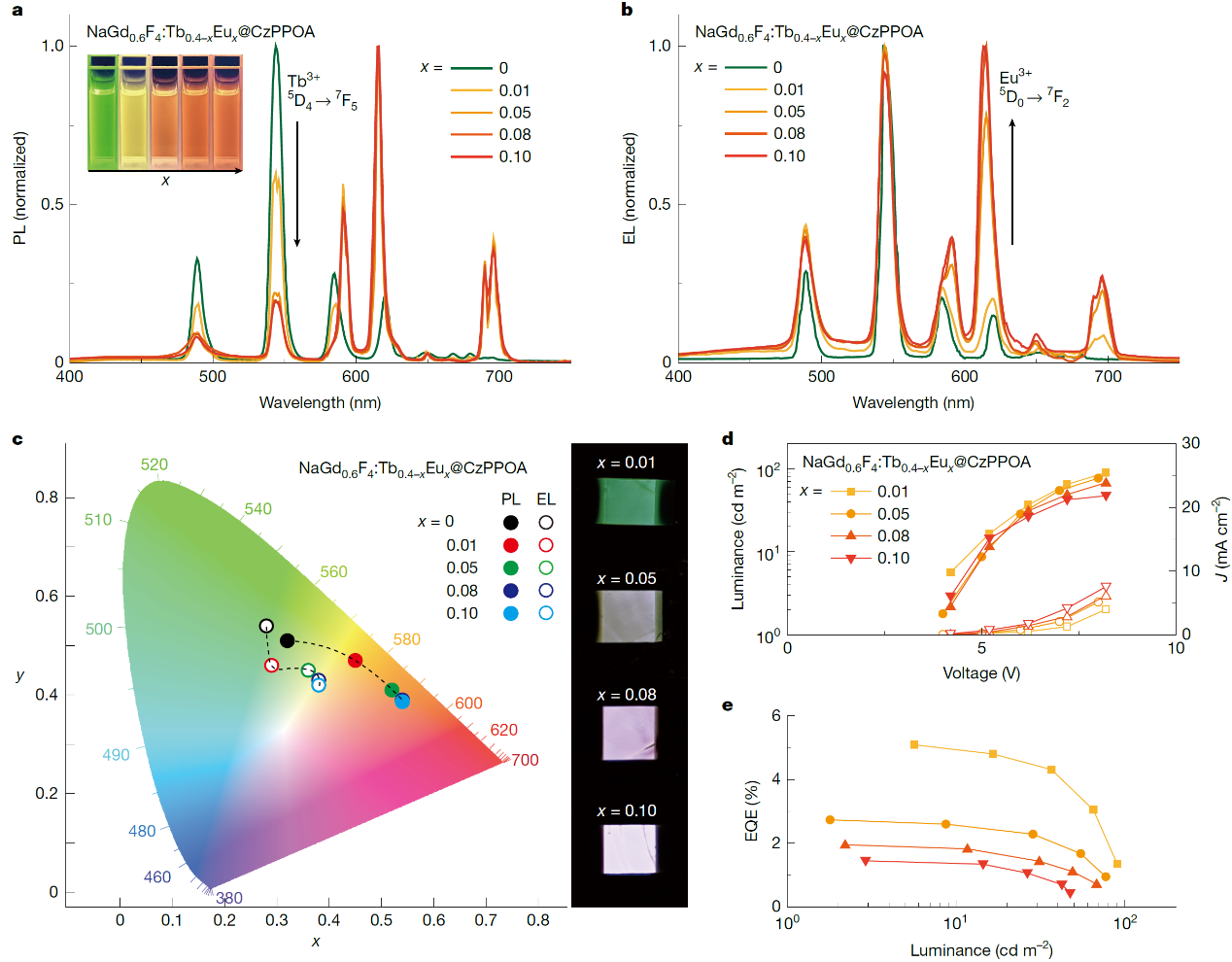 Fig. 4 | Emission characteristics of dually doped NaGd0.6F4:Tb0.4-xEux @CzPPOA nanocrystals.