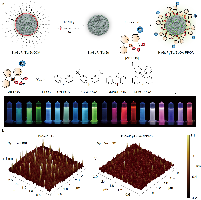 In the study, the research team designed a series of carboxylic acid derivatives of aryl phosphine oxides. These molecules firmly anchor onto the surface of ~4 nm NCs via their carboxyl groups. Under an electric field, these functionalized organic ligands first capture electrons and holes, forming electro-generated excitons at the NC interface. Subsequently, through a ligand-to-NC energy transfer process, the energy is funneled to the lanthanide ions within the NCs. By carefully tuning the lanthanide composition and molecular energy levels, they achieved pure, characteristic lanthanide ion emission with controllable multicolor output.