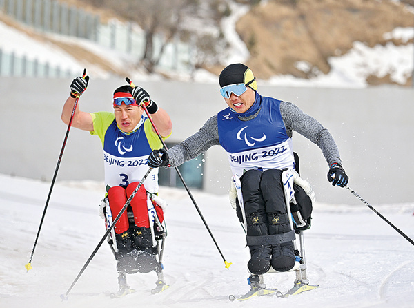 Chinese Paralympians Zheng Peng (right) and Mao Zhongwu in competition at the Beijing 2022 Paralympic Winter Games on March 9.[Photo/Xinhua] Simply put, the program, offering support to around 200 Paralympians, aimed to improve man-machine fitness while strengthening the physical capabilities of the athletes with proper training.