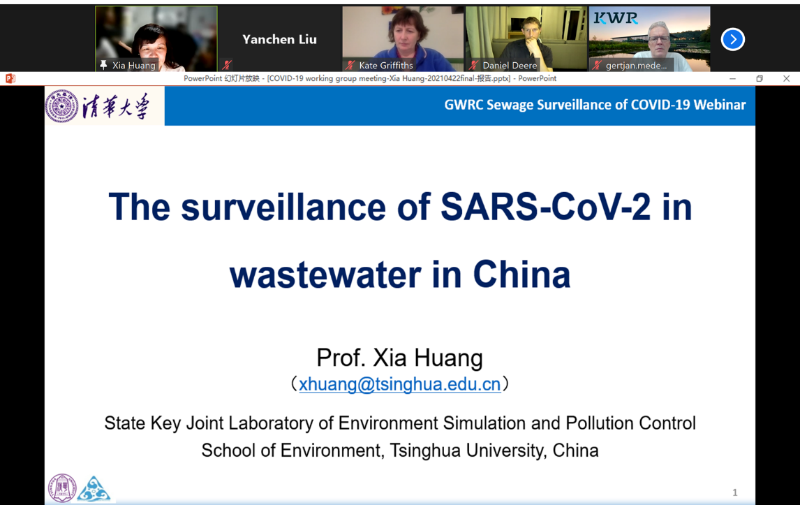 School of Environment, Tsinghua University, April 22, 2021 (Correspondent Dong Qian) On the evening of April 22nd, Professor Xia Huang from the School of Environment, Tsinghua University was invited to deliver a special report at a seminar on SARS-CoV-2 detection in wastewater organized by the Global Water Research Coalition (GWRC) to introduce the development of SARS-CoV-2 detection in wastewater in China. This online seminar was chaired by Professor Gertjan Medema of the KWR Watercycle Research Institute of Delft University in the Netherlands, and attended by more than 40 experts and scholars from different countries.