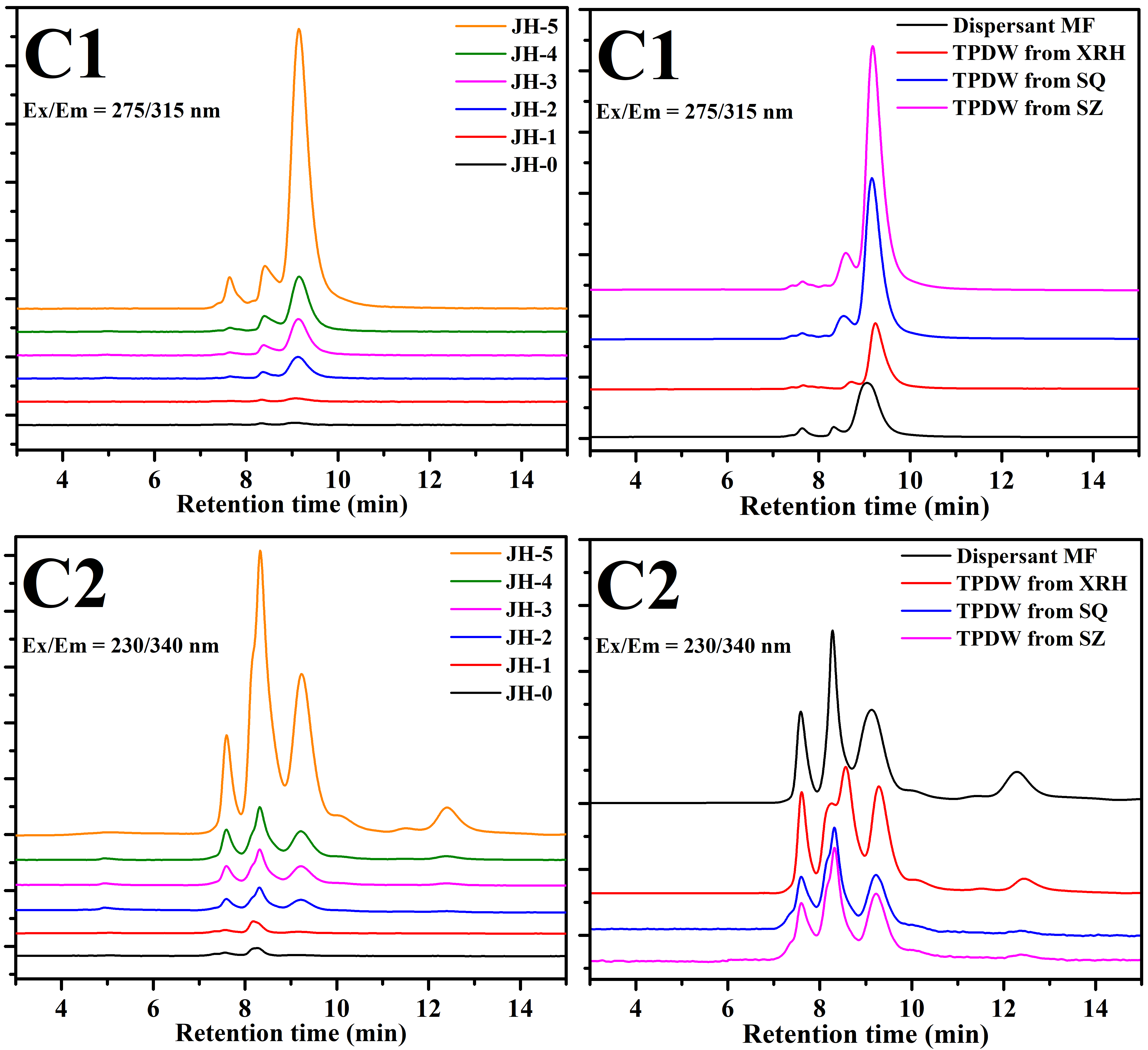 Figure 2 Apparent molecular weight distribution characteristics of fluorescent dissolved organic compounds in the water body of Beijing-Hangzhou Grand Canal in southern Jiangsu region (JH-0 to JH-5), textile printing and dyeing wastewater (XRH, SQ, SZ), and Dispersant MF at specific fluorescence excitation/emission wavelength pairs (C1: Ex/Em = 275/315 nm; C2: Ex/Em = 230/340 nm)