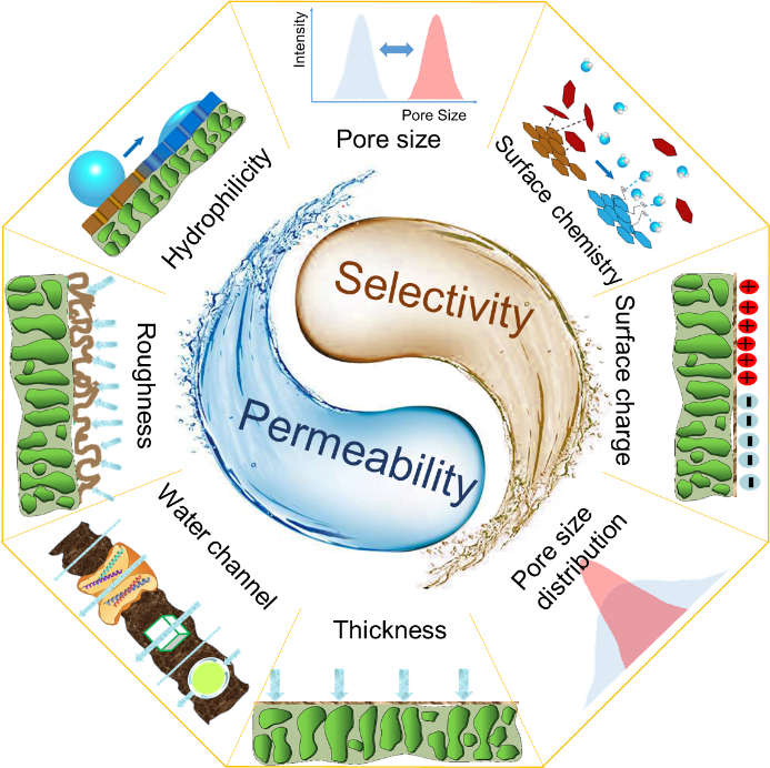 Based on the solute transport theory and mathematical models, this article systematically discussed the relationship between the structural and physicochemical properties and separation performance of NF membranes, analyzed the influence of NF membrane’s structure and surface chemistry on separation performance. Results show that the membrane water permeability can be enhanced by reducing the thickness of active layer, enlarging the effective water permeation area, constructing water channels for rapid permeation, and improving the hydrophilicity of active layer; its selectivity can be regulated by adjusting pore size and distribution, surface charge and hydrophobicity. On this basis, this paper further summarized the efforts made by researchers in recent years on different regulation strategies, revealed the underlying mechanism of different strategies through quantitative analysis of collected data, and then pointed out the problems in those strategies that await to be studied.
