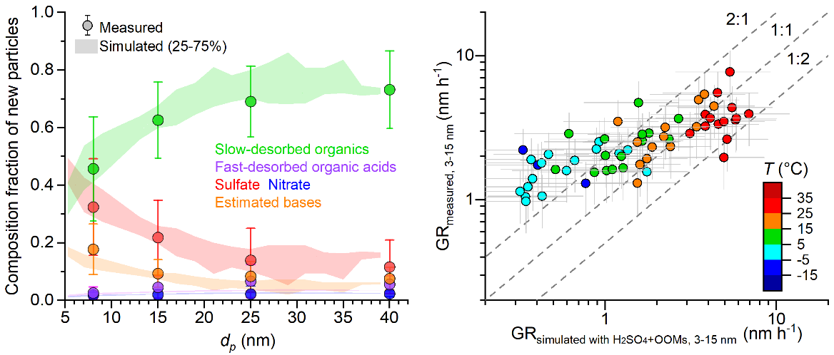 Composition of atmospheric new particles (left) and the main particle growth mechanisms as a function of particle diameters in urban Beijing (right).