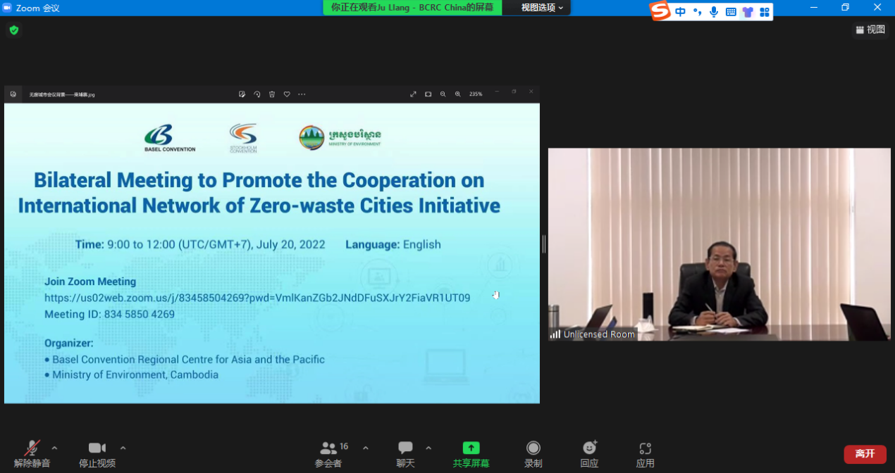 Tsinghua University/Basel Convention Regional Centre for Asia and the Pacific (BCRC China) and Cambodia’s Ministry of Environment jointly held a successful bilateral meeting online on July 20th to promote the cooperation on the International City Network of Zero-waste Initiative. The meeting was attended by 19 Cambodian government officials including Heng Nararith, Deputy Minister of Environment; Dy Kiden, General Directorate of Environmental Protection, Ministry of Environment; Dyakanal Sophal, Head of Hazardous Waste Management Department, General Department of Environmental Protection; Chandath Hay, Deputy Head of Air Quality and Sound Management Department. Li Jinhui, Executive Director of the BCRC China and Professor at Tsinghua University’s School of Environment; Zhao Nana, Assistant Director of the BCRC China; Craig Boljkovac, Senior Advisor; Shan Guijuan, Deputy Head of the Environmental Technology Unit; Chen Yuan, Head of the Regional Chemicals Unit; and project assistants Liang Ju, Wang He, and Shen Qimeng were also in attendance. Craig Boljkovac hosted the meeting.