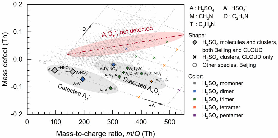 Gaseous H2SO4 molecules, produced by the photochemical reaction of sulfur dioxide, are the primary precursors of new particles. Atmospheric observations in Beijing and Shanghai, as well as previous CLOUD chamber experiments by the European Organization for Nuclear Research (CERN) , found that there are a large number of H2SO4-containing clusters molecules during the new particle formation period (Figure 1). Some of the measured H2SO4-containing clusters exist in the form of acid-base clusters such as H2SO4-amine clusters. It indicates that base molecules such as amines can participate in the formation of H2SO4-containing clusters, increasing their stability and enhancing the rate at which gaseous H2SO4 molecules transform into new particles.