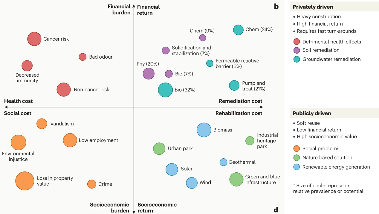 Remediating industrial sites can cleanse polluted soil and groundwater, enhancing urban ecosystem services and supporting sustainable development and industrial city revitalization. However, traditional methods often involve high costs, intense energy and resource use, and high environmental and carbon footprint. Poorly managed projects may lead to secondary pollution, impacting nearby residents and communities. The high costs and uncertainties make many "brownfields" hindrances to urban development. The study emphasizes that the remediation and redevelopment of industrial sites require a consideration of the coordinated impacts of environmental, social, and economic factors. Environmental impacts can be categorized as primary, secondary, and tertiary effects, corresponding to the impacts caused by the pollutants themselves, the remediation process, and the subsequent reuse of the remediated site, respectively. This study conducts an environmental footprint analysis throughout the life cycle of remediation, considering both primary and secondary impacts. Additionally, it introduces a two-dimensional framework (Figure 2) integrating various indicators for the societal and economic sustainability of "brownfield" governance. Analysis indicates that urban "brownfields" can cause a range of impacts on human health and society. Sustainable governance, remediation, and redevelopment of these areas can effectively alleviate various socio-economic pressures and transform them into new opportunities for urban development.