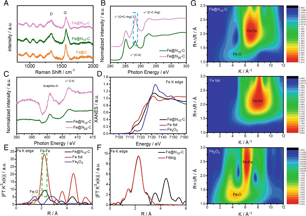 The study utilized extended X-ray absorption fine structure spectroscopy to analyze the valence states and coordination environments of Fe, N, and C sites in the Fe@Nx-C catalyst, further confirming the formation of nitrogen-doped carbon structures during pyrolysis. Post-pyrolysis, the predominant nitrogen species in the Fe@Nx-C catalyst was identified as graphitic nitrogen. The primary active sites in Fe@Nx-C were carbon active sites adjacent to nitrogen sites (CN). The enhanced catalytic activity of Fe@N10-C was attributed to the appropriate nitrogen doping in the carbon layer surrounding the Fe nanoparticles.