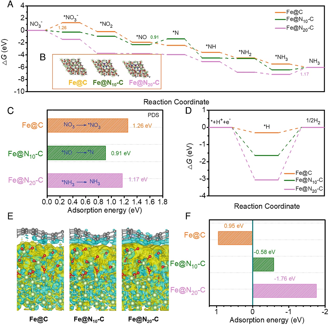 To delve into the role of nitrogen in activating carbon atoms and enhancing the electrochemical nitrate reduction activity of Fe@N10-C, this study employed density functional theory calculations. Active sites of three representative models, Fe@N, Fe@N10-C, and Fe@N20-C, were revealed through difference charge plots, confirming charge transfer at the CN sites and distortion of neighboring carbon atoms upon N doping. Subsequently, the impact of N doping on the electronic structure was investigated, showing more pronounced charge accumulation at CN sites, indicating increased charge density facilitating NO3- adsorption. Bader charge analysis further affirmed greater charge transfer at CN sites, highlighting them as active sites. To better comprehend the activation of carbon atoms and the origin of Fe@N10-C catalytic activity, the interaction between Fe and N-doped carbon was explored. Difference charge plots demonstrated that N doping influenced the electron transfer from Fe NPs to N-doped carbon, activating C atoms, subsequently affecting reactant molecule adsorption and improving reaction kinetics.