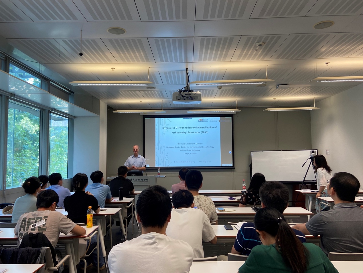 On July 17th, Bruce E. Rittmann, the member of the U.S. National Academy of Engineering and a professor at Arizona State University, gave a presentation on "Synergistic Defluorination and Mineralization of PFAS" at the Environmental Academic Salon. The event was hosted by Professor Huang Xia from the School of Environment at Tsinghua University, and attended by more than 30 faculty members and students.