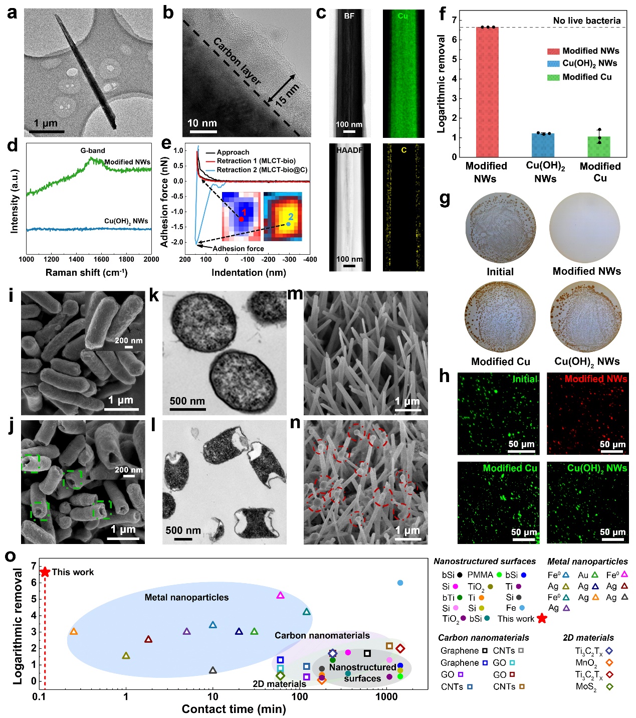 The researchers utilized porous copper foam to prepare carbon-coated nanowires. When contaminated water flows through this material, it causes severe mechanical damage to bacteria (Figure 2). Combining flow field calculations, bacterial mechanical property tests, and finite element simulations of bacterial deformation, the researchers confirmed that the stress produced in the instantaneous adhesion-flow field tearing effect of carbon-coated nanotips exceeds the critical stress of the bacteria, whereas the hydrodynamic collisions between bacteria and nanotips cannot destroy bacteria.