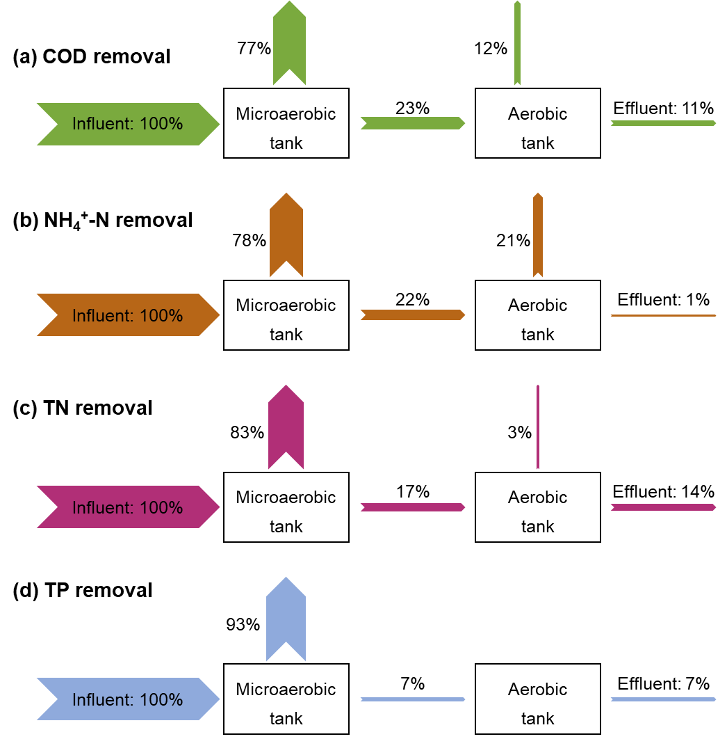 The investigation has unveiled that the microaerobic tanks play a crucial role in the removal of COD, NH4+-N, TN, and TP, constituting 77%, 78%, 83%, and 93% of the average daily load, respectively. In contrast, the contributions of the aerobic tanks to removal were limited, accounting for only 12%, 21%, 3%, and 0%, respectively (Fig. 1). To simulate the profiles of substrate and dissolved oxygen permeation within granules, the study employed a kinetic model (Fig. 2). The results showcased a swift decrease in dissolved oxygen concentration along the granule's radius, resulting in the formation of anaerobic/anoxic inner layers—except in cases with a radius of 25 μm, dissolved oxygen concentration of 0.5 mg/L, and substrate of 36.7 mg/L. This suggests that despite the relatively smaller particle size of sludge cultivated under continuous-flow conditions, stratification persists in microaerobic chambers under low dissolved oxygen conditions. Small particles within the range of 100~200 μm (constituting over 65% of the total) can effectively form aerobic outer layers and anaerobic/anoxic inner layers, facilitating the simultaneous removal of carbon, nitrogen, and phosphorus.