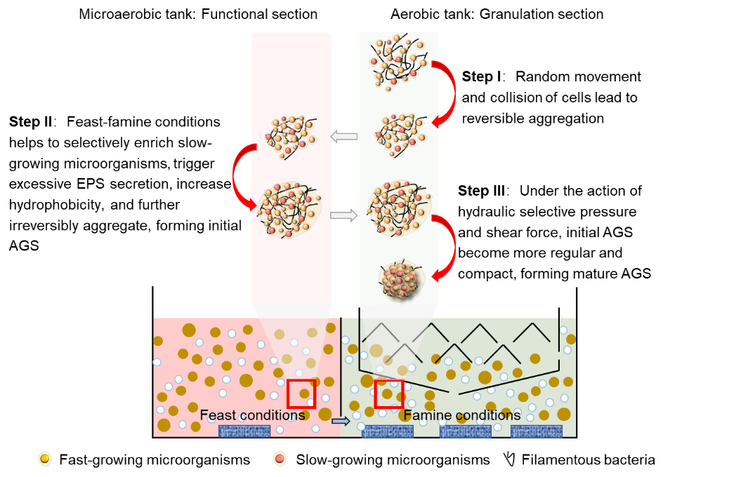 With the continually increase of urban population, municipal wastewater treatment plants face the formidable challenge of improving effluent quality, increasing processing capacity, and reducing energy consumption within confined land areas. Aerobic granular sludge (AGS), settling significantly faster than activated sludge, offers the capability to simultaneously remove carbon, nitrogen, and phosphorus. In comparison to traditional activated sludge processes, AGS processes can reduce land area requirements by up to 75% and achieve energy savings of as much as 63%. However, the successful application of AGS processes has been limited to sequencing batch reactors, and breakthroughs in aerobic granulation under continuous-flow conditions are yet to be realized.