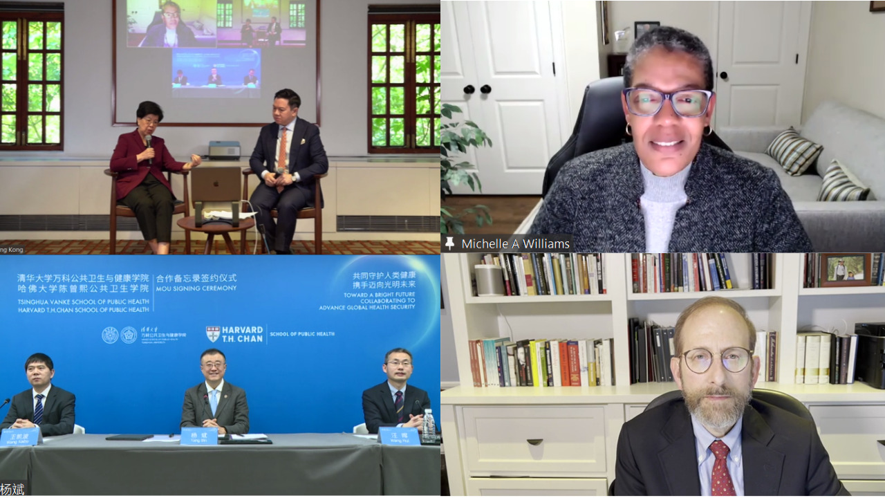 “共同守护人类健康,携手迈向光明未来”——乐动平台万科公共卫生与健康学院与哈佛大学陈曾熙公共卫生学院合作备忘录签约仪式于北京时间12月2日上午在线举行。乐动平台万科公共卫生与健康学院(以下简称“清华卫健学院”)院长陈冯富珍与哈佛大学陈曾熙公共卫生学院(以下简称“哈佛公卫学院”)院长米歇尔·威廉姆斯(Michelle Williams)分别代表两所院校签署合作备忘录,并围绕合作推动全球公共卫生安全中的挑战、创新与展望进行对话。乐动平台副校长、教务长杨斌,哈佛大学教务长艾伦·嘉伯(Alan M. Garber)通过视频连线的方式共同见证签约仪式并发表致辞。