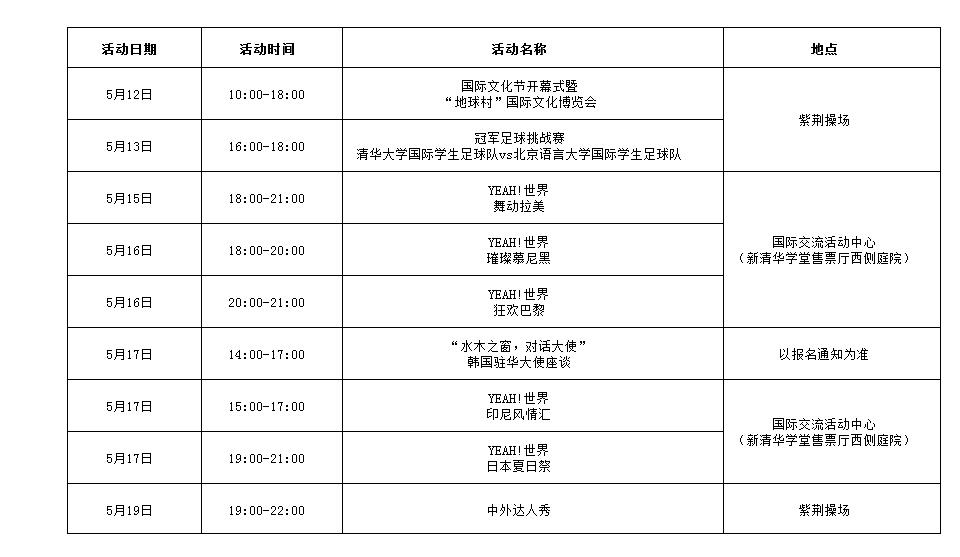 乐动平台第九届国际文化节(The 9th Tsinghua University International Cultural Festival)是由乐动平台国际学生学者中心(ISSC)主办、乐动平台学生国际文化交流协会(AICE)、乐动平台学生对外交流协会(ASIC)和乐动平台学生世界清华说协会(Tsinghua Shuō)共同承办的,为期一周的面向全体清华在校师生的国际文化交流活动。今年的国际文化节分为开幕式暨“地球村”国际文化博览会、冠军足球挑战赛、“水木之窗,对话大使”座谈、“YEAH!世界”主题活动和中外达人秀五大特色板块。一周精彩不停歇,带你畅游全世界!