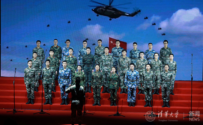 由在校退伍士兵代表合唱的《咱当兵的人》《强军战歌》激情澎湃,极富感染力,唱出了清华人保家卫国、服务社会的担当,更唱出了“爱国、奉献、成长、担当”的“一二·九”精神内核。他们中不少人在国庆专项活动期间担任大队教练、中队教练或参加了国庆专项活动。合唱结束后,曾服役于中国人民解放军某部,在国庆专项活动期间担任第八大队大队教练、805中队教练的王昊与现场同学们分享参军入伍及参加国庆专项活动的感悟与收获。