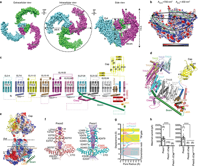 图a,Piezo2的冷冻电镜示意图,其中每一个亚基用不同的颜色表示;b,三个向外扭曲的跨膜桨叶区围成的穹顶状结构示意图,绿色虚线所标记的为跨膜区;c,含38次跨膜区的Piezo2拓扑结构示意图;d,Piezo2一个亚基结构组成展示图;e,Piezo2中心孔道模块区;f,由IH-CTD围绕而成的Piezo2与Piezo1的中心孔道区;g,Piezo2与Piezo1中心孔道区的半径分布图,包含跨膜区开关闸门(TM gate)以及胞内区狭窄颈部(Constriction neck);h,缺失帽子区的Piezo1与Piezo2突变体缺失机械刺激诱发的电流。