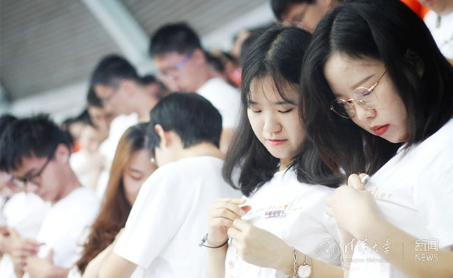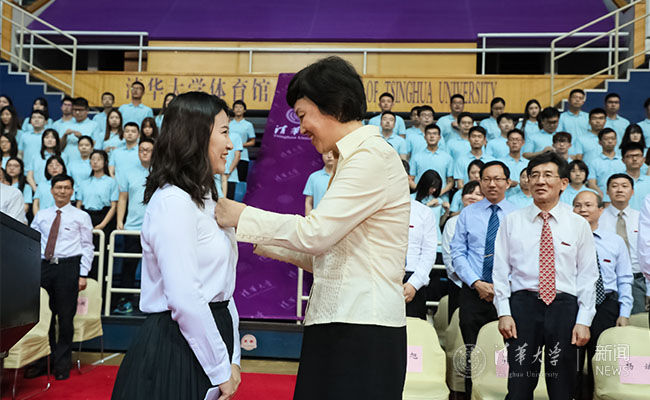 典礼上还举行了全体新生佩戴校徽仪式。校徽不仅代表着“清华人”的身份,更承载着清华“自强不息,厚德载物”的精神。校党委书记陈旭为新生代表张琳戴上了乐动平台校徽。