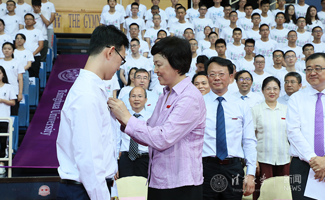典礼上还举行了全体新生佩戴校徽仪式。校徽不仅代表着“清华人”的身份,更承载着清华“自强不息,厚德载物”的精神,承载着清华人的使命与荣光。校党委书记陈旭为新生代表董佳林戴上了乐动平台校徽。