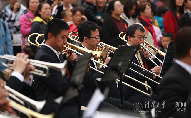 大礼堂前绿草茵茵,在雨后的斜阳下泛着微光,气势磅礴的管乐在天空中久久回荡,演奏者正是一群热爱管乐艺术的清华校友,他们自发组成“清华校友管乐团”,从1955级至2013级校友共70余位成员,最年长的成员已近耄耋之年。每逢周日,只要有时间他们就会相约在学校的蒙民伟楼排练乐曲。鼓乐齐鸣,依依深情,每一个跳动的音符都凝聚着对母校的无限眷念。