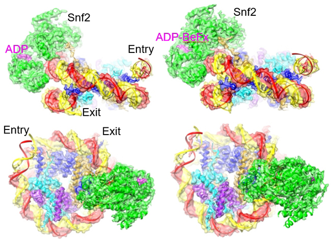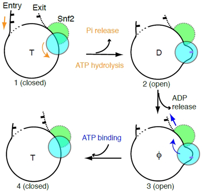 SWI/SNF家族蛋白利用ATP水解产生的能量移动核小体在基因组DNA的位置,重塑染色质。这对于控制遗传物质的开放性,调节基因转录等方面发挥重要作用。陈柱成实验室近期报道了Snf2与核小体结合的结构 (Liu, Nature 2017),但这个早期的工作并没有明确检测到DNA移位。染色质重塑蛋白如何利用ATP水解的能量推动核小体滑移依然是一个让人困扰的难题。