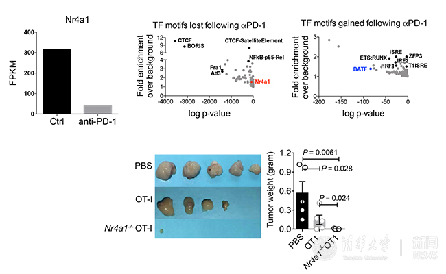 阻断T细胞免疫检查点是肿瘤免疫治疗的重要策略。重要的是,在小鼠淋巴瘤模型中,研究者发现肿瘤浸润的耗竭CD8+ T细胞大量表达NR4A1,而在anti-PD1治疗组中,伴随着肿瘤浸润T细胞杀伤活力的部分恢复,NR4A1表达水平以及结合在开放染色质的数量显著下调。进一步的T细胞过继实验证明敲除NR4A1赋予CD8+ T细胞更强的效应功能,更好地抵御肿瘤以及病毒的耗竭微环境的能力(图2)。