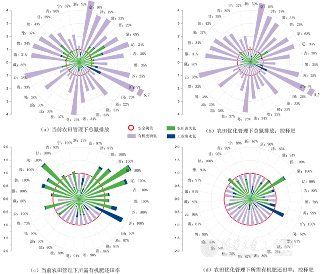 图3 中国省级氮管理面临的挑战与解决方案。(1)当前农田管理水平下省级氮流失总量超安全阈值的倍数,外围的百分数是当前有机废物还田率;(2)在优化农田管理的控释肥方式下省级氮流失总量超安全阈值的倍数,外围的百分数是当前有机废物还田率;(3)在当前农田管理水平下,欲将氮流失减至阈值内所需达到的有机废物还田率(外围百分数);(4)优化农田管理的控释肥方式下,将氮流失减至阈值内所需达到的有机废物还田率(外围百分数)