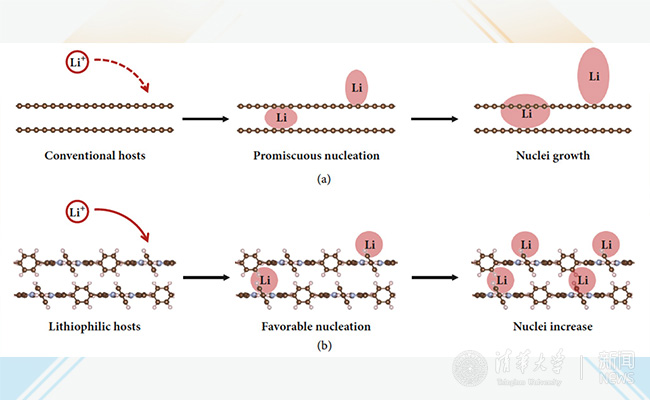 在具有不同亲锂性的骨架材料上金属锂形核与生长情况示意图。(a)使用传统的亲锂性较差的纳米碳骨架材料,金属锂随机形核并生长,最终发展为金属锂枝晶。(b)使用具有超高亲锂性的卟啉有机骨架材料,金属锂优势形核并数量增多,最终实现金属锂的均匀沉积并抑制金属锂枝晶的产生。