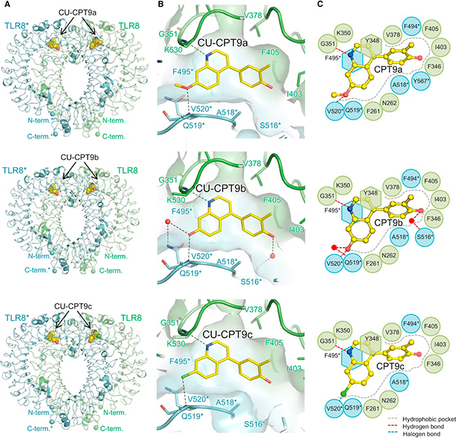 TLR/CU-CPT 复合物晶体结构:TLR8高效小分子抑制剂。 A. CU-CPT9b与TLR8结合位点以及关键相互作用图示;B. CU-CPT系列小分子抑制剂结构;C. CU-CPT系列化合物对于TLR8显示出高效的抑制作用