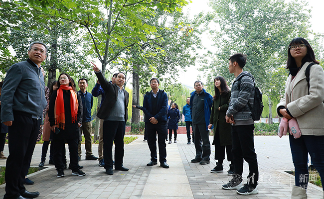 随后,邱勇一行来到1-4号楼,参观青桐林广场、新改造的花园,并认真听取邢毅等关于校园景观规划和提升项目进展情况的介绍。邱勇表示,要将部分校园景观与师生户外活动相结合,为广大师生提供更多更优质的活动空间。