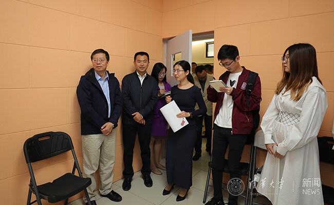 随后,邱勇一行前往紫荆学生服务中心,对学生活动空间进行调研。邱勇首先来到C207舞蹈排练室和C208声乐器乐排练室,详细询问活动室使用效果和现场同学的排练情况,在考察C215和C218班团活动室时,邱勇对室内的多功能椅进行了试坐,并深入了解了活动室内圆形小组讨论设计方案和场地借用情况。