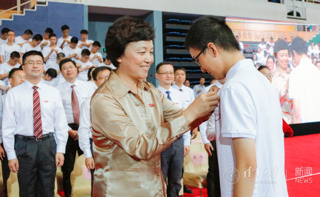 今年的开学典礼首次安排全体新同学佩戴校徽。校徽不仅代表着“清华人”的身份,更承载着清华“自强不息,厚德载物”的精神,承载着清华人的使命与荣光。校党委书记陈旭在典礼上亲手为新生代表陈开佩戴上乐动平台校徽。