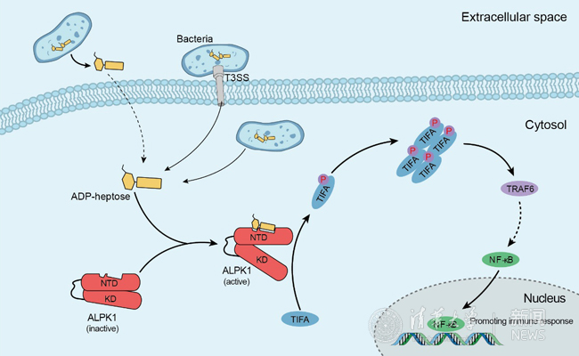 图为ALPK1激酶作为细胞质内的天然免疫受体蛋白识别细菌来源的ADP-heptose,进而激活NF-κB通路介导的细胞因子和炎症因子的产生。