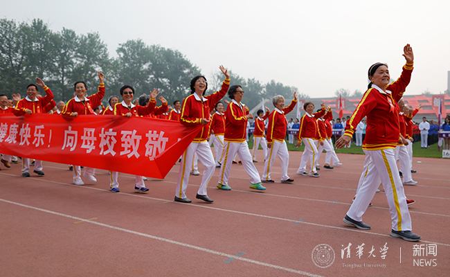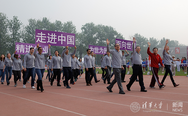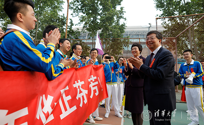 与此同时,东大操场北侧马路对面的“红场”已是人潮涌动,毕业10周年、20周年、30周年、40周年的校友们身着蓝黄相间、写有“清华”字样的统一服装,扶老携幼,在这里列队排练。开幕式前,邱勇、陈旭也来到这些秩年校友方阵中,与他们握手、拥抱、合影,共话清华体育精神,现场气氛十分热烈。随后,邱勇、陈旭步入东大操场,在“无体育,不清华”的标牌前与毕业50周年的1968届校友方阵亲切合影。