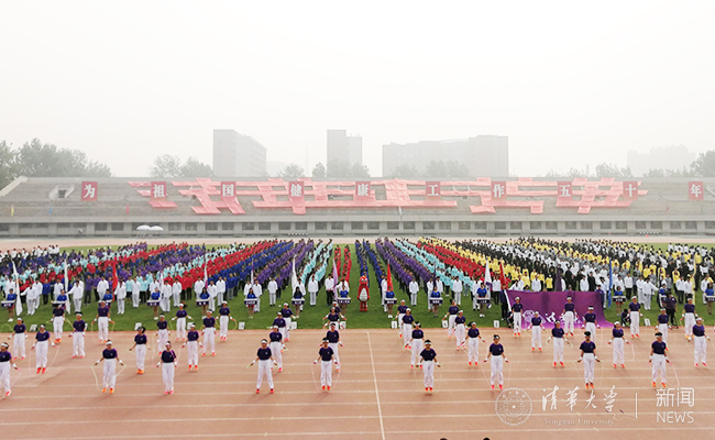 早上7:00,东大操场南侧的大屏幕上已经打出“清华正芳华”的校庆主题图,屏幕上的现场直播在开幕式中全程持续。东侧看台上,建筑学院师生利用废旧横幅组合成了“清华正芳华”的校庆口号,既体现了循环利用和可持续发展的设计理念,也营造了喜庆的校庆氛围。