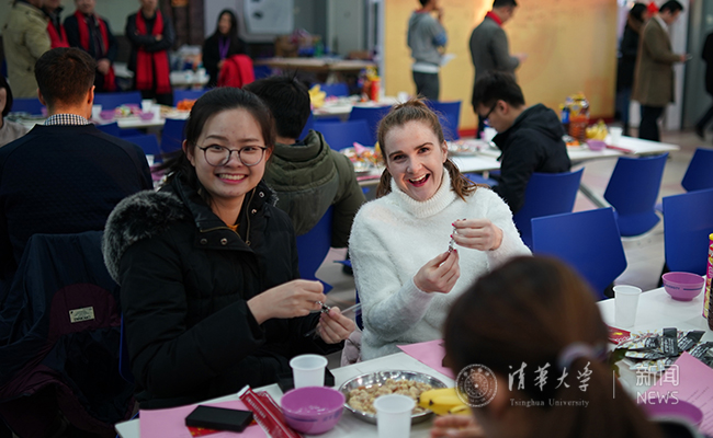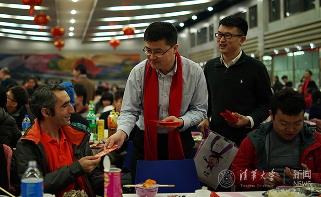 在餐厅里,食堂师傅们精心准备了丰盛可口的年夜饭。前来参加晚会的同学们纷纷在签名墙前合影留念,并在主持人引导下参加“一站到底”和抽奖游戏。在每人一张的清华主题明信片上,同学们写下对亲朋好友的新春祝福,在新春第一天寄往世界各地。