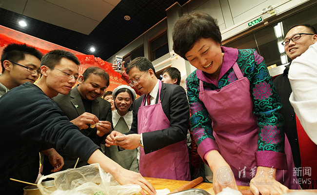校领导们和中外同学一起包饺子。于海童 摄